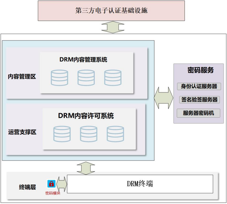 電視數字版權管理系統主要包括DRM運營區(qū)、DRM客戶端及DRM內容管理區(qū),數字版權管理(DRM)密碼應用解決方案通過設計密碼服務區(qū),依托第三方電子認證基礎設施,實現DRM內容發(fā)送給DRM客戶端之前采用國產密碼算法體系簽名加密實現內容的完整性和機密性保護,同時DRM運營區(qū)對被授權設備和內容的使用權限及密鑰進行簽名及加密保護,?DRM 終端身份認證認證成功獲得權限后可對內容解密。